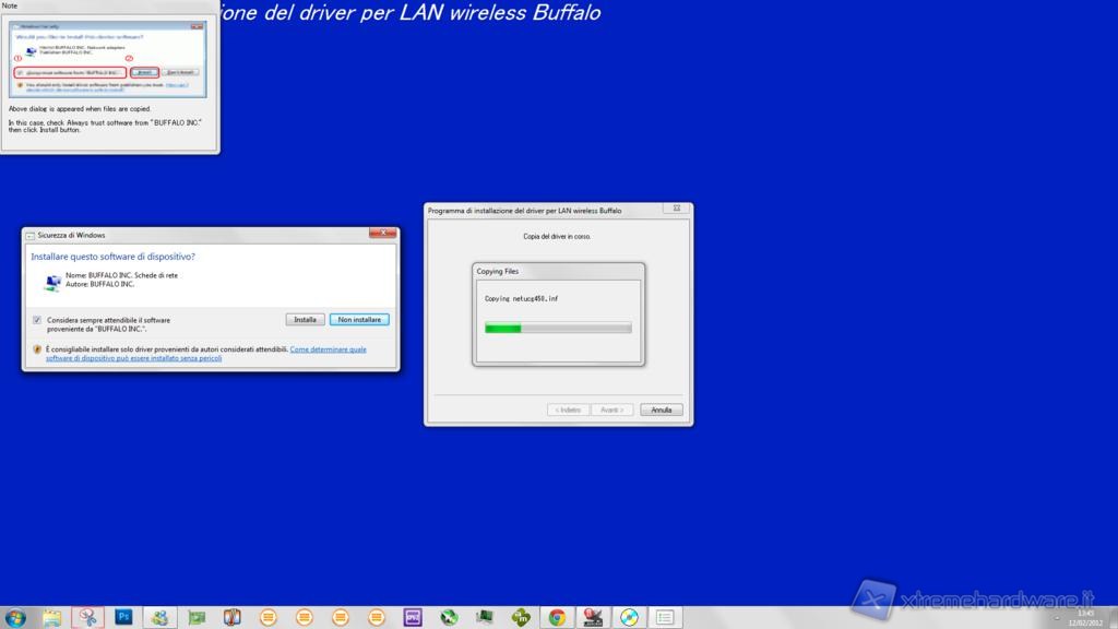 Avviata l'installazione il sistema operativo non riconoscerà l'autore del driver come attendibile, pertanto sarà necessario attestare l'attendibilità inserendo il segno di spunta alla scritta "Considera sempre attendibile il software proveniente da Buffalo Inc." per bypassare questo blocco. Completata l'installazione, un messaggio ci informerà che la chiavetta è correttamente settata ad una frequenza di 40MHz (al massimo).