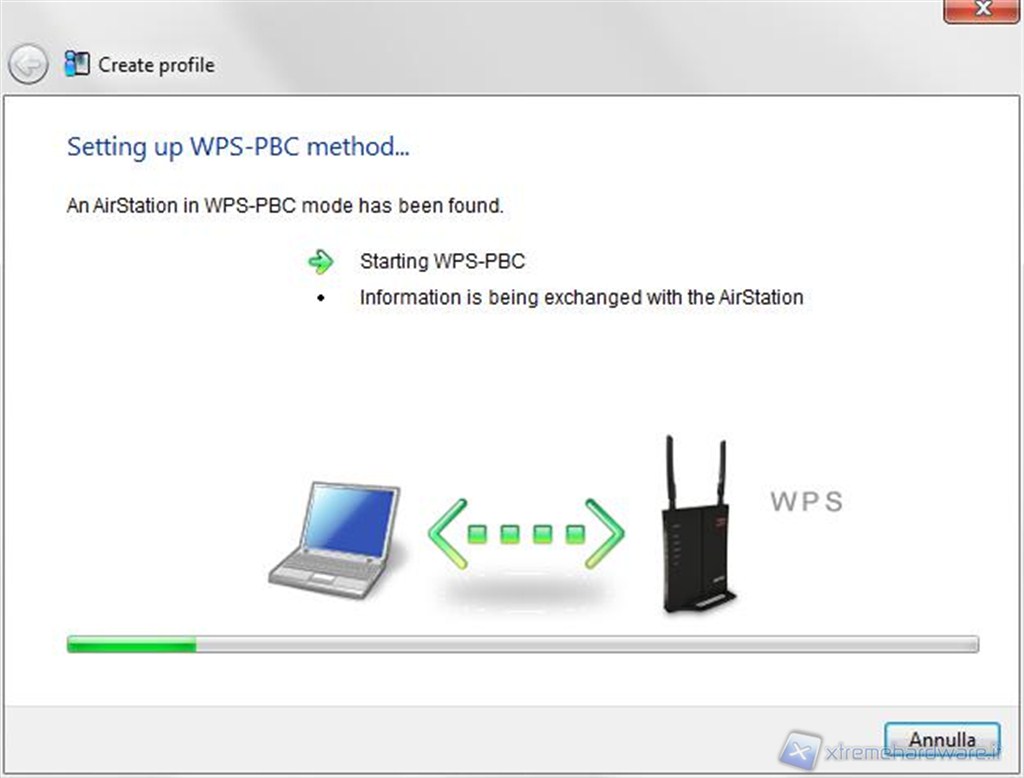 Ci verrà quindi richiesto di creare un profilo per la connessione. Grazie alla funzione AOSS presente su entrambi i dispositivi non ci sarà bisogno di inserire PIN o password, ma basterà cliccare sul pulsante AOSS nella schermata e successivamente tenere premuto il pulsante AOSS del router per circa 3 secondi (fino a quando la spia luminosa non lampeggia). Il sistema connetterà automaticamente l’adattatore N450USB al router HighPower N450.